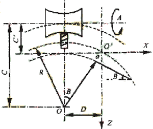 考虑刀具摆动到任意位置 a 时,工件中心应始终在以 O 为圆心,以 C 为半径的圆弧上。而 B 轴中心应始终在以 O 为圆心,以 R 为半径的圆弧上。且有