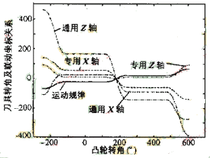 图 5 为 SJH350.8 凸轮分别在通用五坐标机床 (D=400mm , C'=0) 和专用五坐标机床 ( D=0 , C'=200mm) 上加工时,凸轮运动规律曲线及 x 、 z 补偿坐标的对比情况。